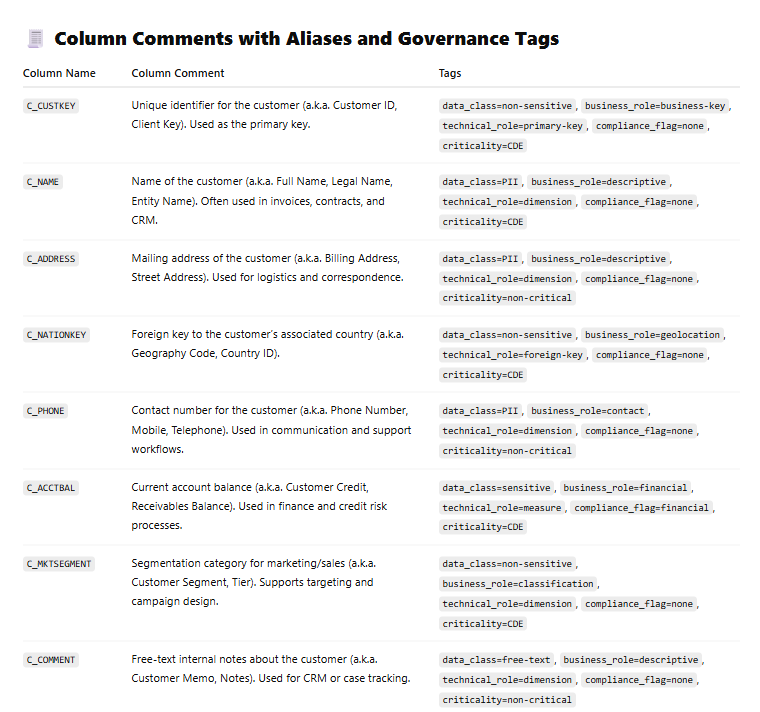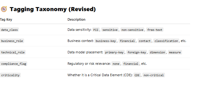 To manage tags enterprise-wide, we require a taxonomy that defines allowable keys and values for tagging attributes. Below is an example taxonomy which we then use to auto-generate tags for our dataset (e.g. for the customer table).