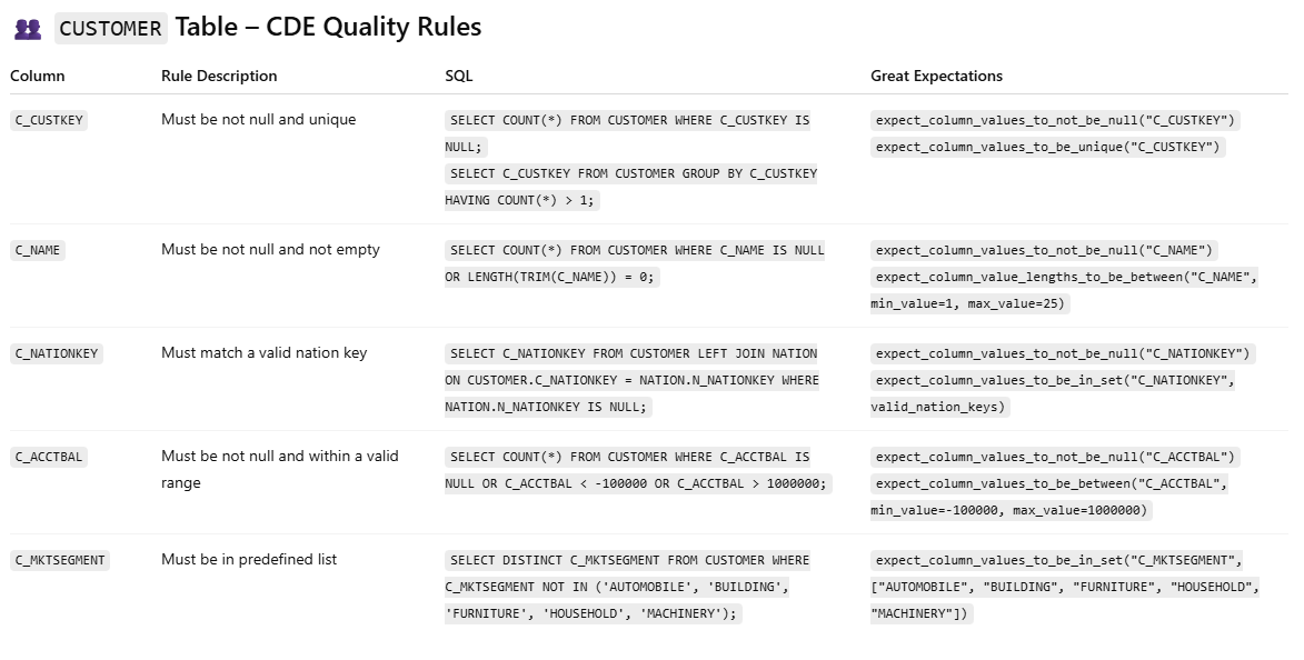 In the example, I ask chatgpt to generate quality rules for Critical Data Elements. These rules can be expressed as SQL checks or in a more declarative syntax like Great Expectation. In minutes you can set up your dataset with quality monitoring whether we rely on sql based tools or opensource quality monitoring tools like Great Expectations. Often, Critical Data Elements Quality might be all you need.